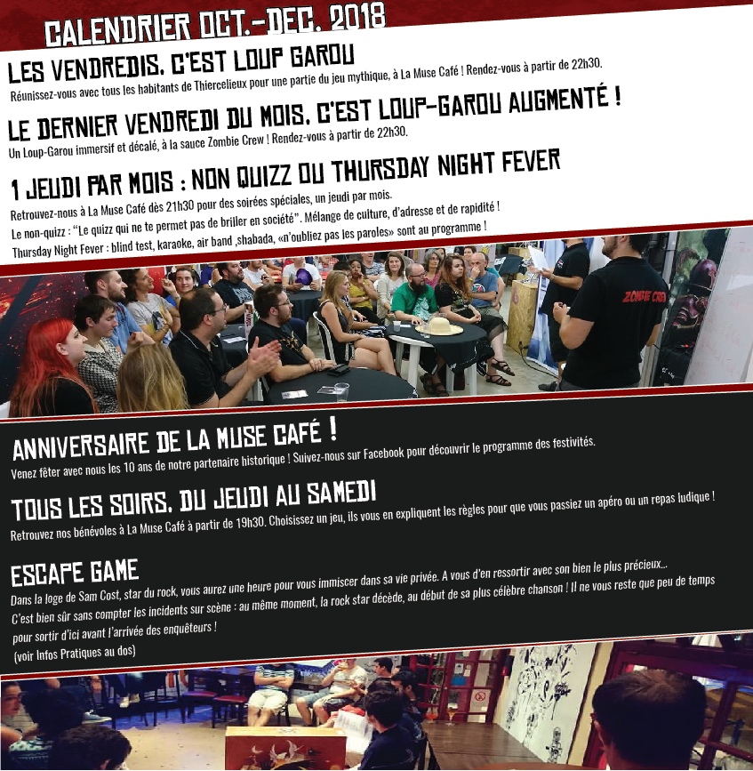 Durant les mois à venir, retrouvez-nous à La Muse Café pour des activités hautes en couleurs : Loup-Garou à la sauce Zombie Crew, blindtests, quizz, escape game, et plus encore !