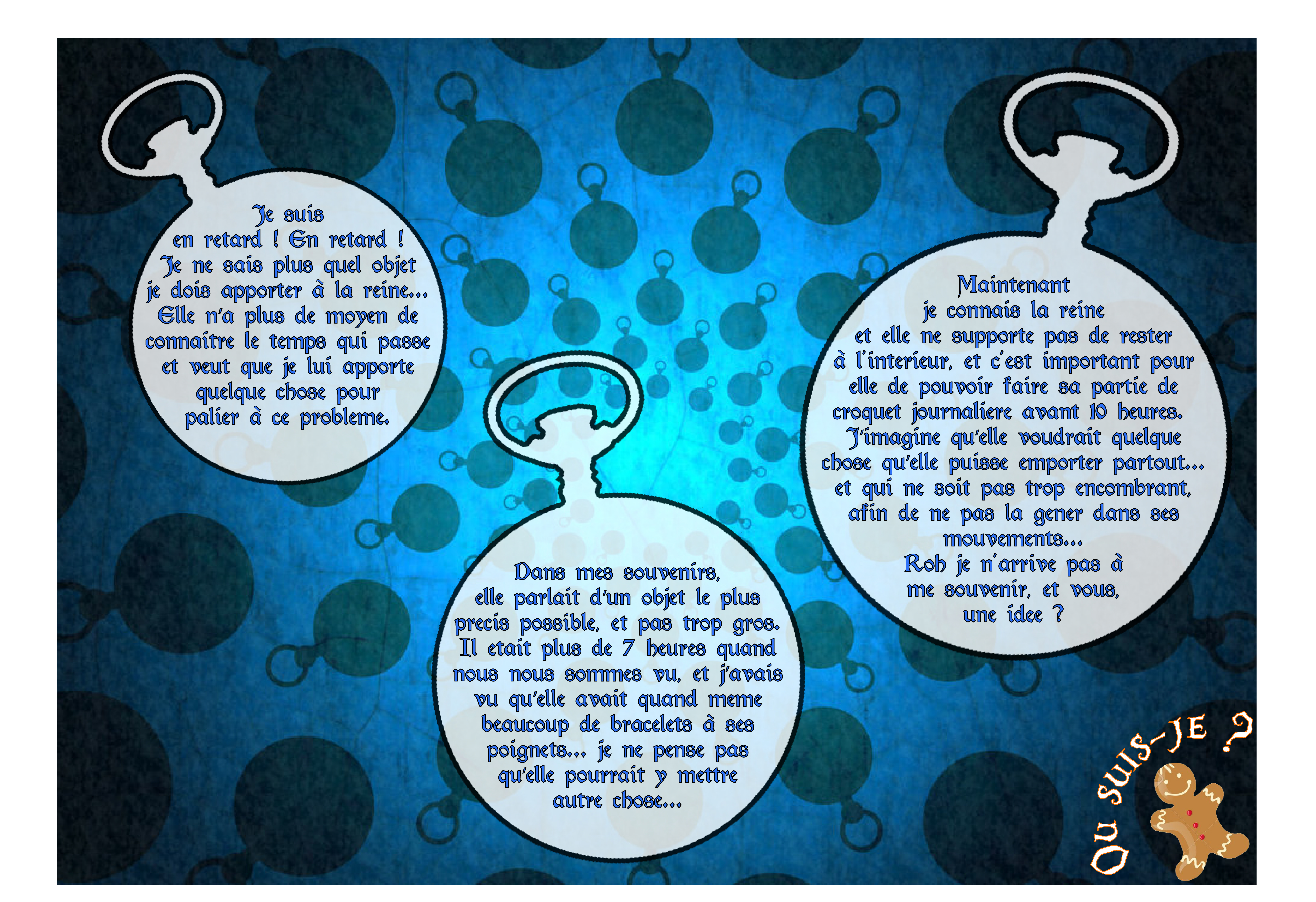 Il faut retrouver Alice – lapin Je n’ai pas le temps, si tu veux savoir, suis moi et hâtes-toi !!!Au fait, je ne possède que quatre coordonnées
